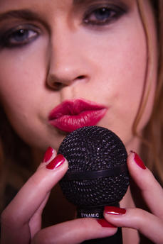 She lies back, thighs splayed, to grind the mic against her moist slit. Focused on what she's feeling, she suddenly realizes there’s something more this time – the audible wet slurp of her pussy around her fingers as the friction builds… But now is not the time to analyse her arousal – she just goes with it and surrenders to her orgasm, moaning out loud. Then she raises the mic to her mouth again, to suck it clean of her juices.